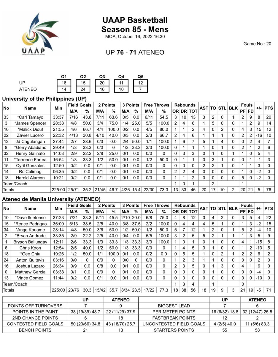 UP 76 - Tamayo 20, Spencer 14, Diouf 12, Lucero 10, Cagulangan 7, Abadiano 6, Galinato 4, Fortea 3, Gonzales 0, Calimag 0, Alarcon 0.
